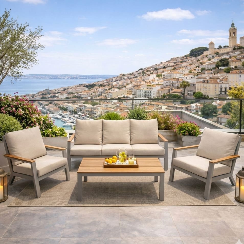 פינת ישיבה דגם פורטו בצבע שמפניה אלומיניום שילוב hpl גדלים : שולחן 120/70 ס"מ כורסא 74/75 ס"מ תלת 175/74 ס"מ